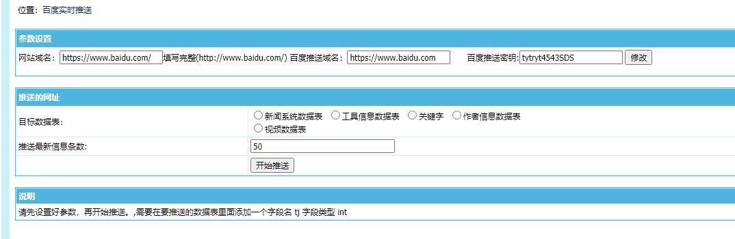 请先设置好参数,再开始推送。,需要在要推送的数据表里面添加一个字段名 tj 字段类型 int